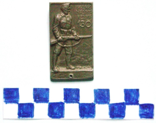 Di forma rettangolare. Al centro, in rilievo, un soldato con fucile spianato e in secondo piano un paesaggio montano. Iscrizione sul lato destro superiore. Un foro al centro della base. Sul verso, spilla di fissaggio ed ulteriore iscrizione.