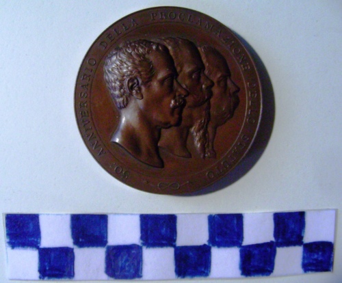 Di forma circolare. Sul recto busti accollati a destra di Carlo Alberto, Vittorio Emanuele II e Umberto I circondati da iscrizione e nodo sabaudo. Sul verso simboli vari del commercio e dell'industria ai piedi di due figure simboleggianti l'Italia seduta che poggia la mano destra sullo scudo sabaudo e con la sinistra regge una lapide con iscrizione. La seconda figura alata rappresenta la città di Torino che regge nella sinistra una bandiera con simbolo sabaudo. in basso al centro, lo stemma della città di Torino. Iscrizioni sulla parte superiore della corona, al centro in alto, e sotto la figura.