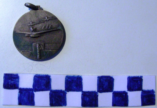 Di forma circolare. Sul recto, al centro, in rilievo tre idrovolanti in volo a sinistra, sopra l'Oceano. Nella parte inferiore un fascio littorio a destra ed iscrizione. Sul verso, in rilievo al centro, una riproduzione del mappamondo con l'indicazione della rotta seguita ed i nomi delle città toccate. Iscrizione lungo la corona. Anello all'appiccagnolo.