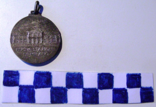 Di forma circolare. Sul recto, al centro in rilievo, prospetto anteriore della nuova stazione ferroviaria di Milano. Iscrizione sotto la figura. Sul verso, iscrizione con sottostante stemma coronato di Milano tra due fasci littori. Anello all'appiccagnolo.
