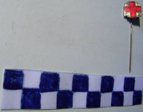A forma di croce greca di colore rosso con profili dorati, sovrastante due fasci littori ed iscrizione dorata. Sul verso, iscirizione e spilla di fissaggio.