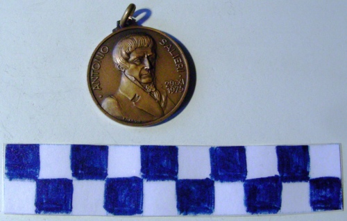 Disco di metallo, sul dritto in bassorilievo il profilo a mezzobusto di Antonio Salieri volto a destra, iscrizione lungo la corona. Sul verso, in bassorilievo, un albero fogliato con sottostanti 5 stemmi comunali coronati, da sinistra il primo di Legnago, il secondo crociato con la testa di Virgilio per Mantova, il terzo, di dimensioni maggiori, crociato per Verona, il quarto crociato per Vicenza, il quinto crociato con due draghi alati nei primi due quartieri per Belluno il tutto a formare il logo della Cassa di Risparmio di Verona, Vicenza, Belluno ed Ancona.