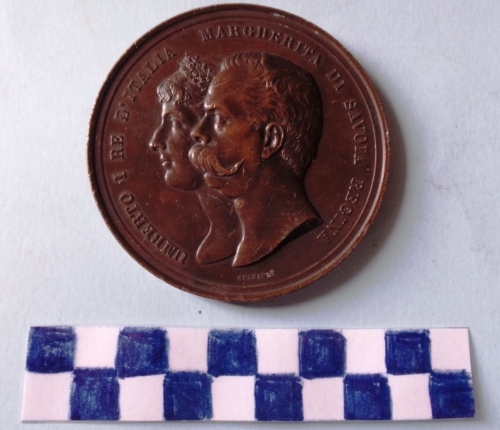 Di forma circolare. Sul recto, al centro, in rilievo, busti accollati a sinistra di Umberto I e Margherita di Savoia. Iscrizione lungo la corona e sotto i busti. sul verso, al centro, in rilievo, Umberto I in piedi a sinistra in uniforme, nell'atto di tendere il braccio per il giuramento. In secondo piano, a sinistra, antenati di casa Savoia, e a destra angelo, con scudo sabaudo, sormontato da stella a cinque punte raggiante. Iscrizioni lungo la corona e in esergo.
