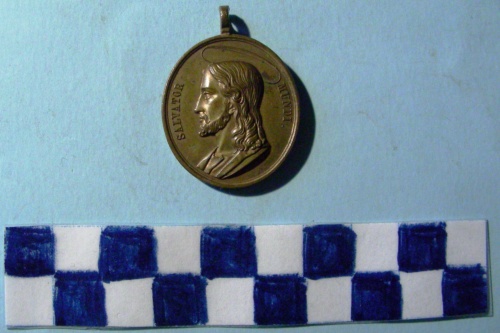 Di forma ovale. Sul recto, al centro in rilievo, busto a destra di Pio IX con berretto, mozzetta e stola. Iscrizione lungo la corona. Sul verso, al centro in rilievo, busto nimbato ed accollato a sinistra di Cristo. Iscrizione lungo la corona.