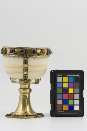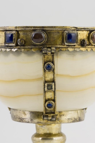 Alto piede troncoconico svasato in argento dorato, liscio, con fascia decorativa lungo il perimetro della base costituita da cabochons in vetro quadrati e rotondi compresi entro due linee di granuli; rigonfiamento anulare verso la coppa. Coppa campaniforme in marmo alabastrino, decorata da una fascia in argento dorato lungo l'orlo e da bande verticali a collegamento della base, tutte decorate da cabochons compresi entro linee di granuli, analogalmente al piede. Una linea di elementi semicircolari corre lungo la parte inferiore della montatura lungo l'orlo