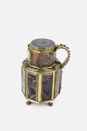 Base costituita da quattro piedini zoomorfi in argento dorato. Corpo ottagonale composto da lastre di sardonica inquadrate da una montatura in argento dorato, entro un perimetro di granuli. Imboccatura ottagonale di dimensioni inferiori ripetto al corpo, anch'essa composta da lastre di sardonica analogalmente al corpo. Coperchio piano in onice rifinito da elementi fitomorfici in argento dorato. Ansa che si imposta sull'orlo e sulla spalla in argento dorato decorata da elementi fitomorfici lungo i due lati