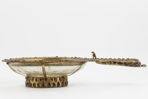 Alto piede ad anello, costituito da una fascia in argento dorato decorato da una doppia linea di pietre preziose a cabochon, di forma irregolare, comprese tra una linea di granuli posta superiormente ed inferiormente. Corpo espanso in vetro incolore decorato a dischi concavi. La montatura lungo l'orlo, costituita da una fascia piatta, ripete la decorazione del piede, una doppia linea di pietre preziose cabochons incluse tra due linee di granuli. La montatura tra piede e orlo è raccordata da sei fascette verticali in argento dorato. Il manico è costituito da un elemento rettilineo con una terminazione semicircolare; nella parte a ridosso dell'orlo si divide in due parti ricurve a becco d'aquila. Anche il manico è decorato da file di perle e pietre preziose contornate da granuli. Un piccolo uccello a tutto tondo è collocato centralmente, nella parte a ridosso dell'orlo