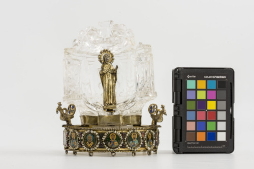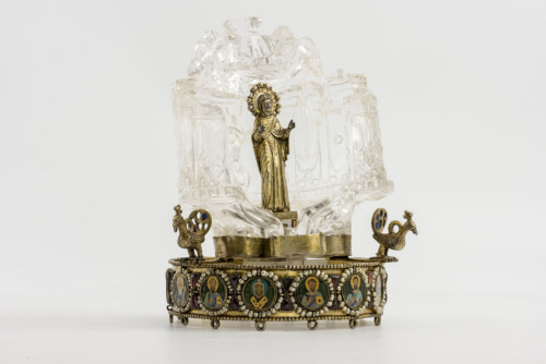 Opera formata da tre elementi diversi: un'edicola in cristallo di rocca intagliato, una statuetta della Vergine al centro a tutto tondo in argento dorato, ed una corona votiva d'argento dorato, smalti policromi e granate, utilizzata come base