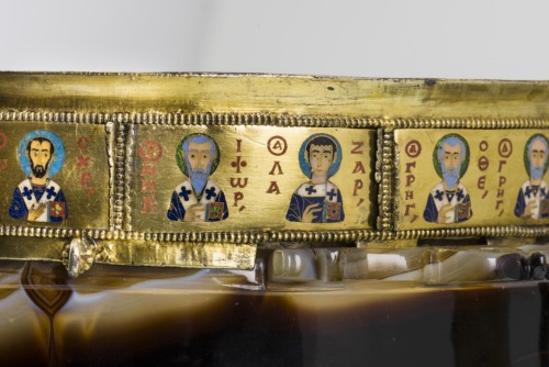Base troncoconica svasata in argento dorato, con rigonfiamento anulare all'impostazione della coppa; lungo il diametro appiattito del piede vi è una fascia decorativa costituita da una linea di granuli, che raddoppia nel bordo inferiore, con al centro cinque placchette trapezoidali d'oro (tre sono mancanti), con due figure a smalto a mezzo busto: rispettivamente di Giorgio e Demetrio, Aussenzio ed Eugenio, Agatonico e Acacio, Floro e Lauro, Oreste e Cristoforo. Al di sopra corre una fascia dove vi sono delle incastonature quadrate e ovali alternate, con pietre blu e bianche, con al di sopra un'altra linea di granuli. La parte superiore della base e il nodo sono decorati a incisione e a niello da due fasce. Quella inferiore con cerchi puntinati, annodati tra loro, che inscrivono una croce greca a bracci patenti, con palmette angolari; quella superiore con palmette e fioroni entro cerchi puntinati uniti da anelli. Sotto la coppa vi è un'iscrizione a smalto blu. Coppa subcilindrica in sardonica con fondo concavo; è munita di due anse simmetriche, costituite da un doppio nastro divergente, unito al centro da una fascetta a modanature orizzontali, terminante nell'attacco superiore con un doppio elemento a tralci vegetali e motivo a goccia centrale con due spirali. Lungo l'orlo corre una fascia in argento dorato la cui decorazione ripete la scansione di quella del piede, con dodici placchette rettangolari (due mancano) con i busti policromi a smalto con coppie di Santi, profilate da granuli: rispettivamente Cristo e della Vergine, due Arcangeli, i santi Giacomo e Filippo, Caralampio e Cipriano, Basilio e Nicola, Antonio e Spiridione, Giovanni il Precursore e Giovanni Crisostomo, Niceforo e Lazzaro, Gregorio il Teologo e Gregorio il Traumaturgo, Pietro e Paolo, Bartolomeo e Simone. Alcuni piccoli anelli sono posizionati sotto le placchette lungo l'orlo