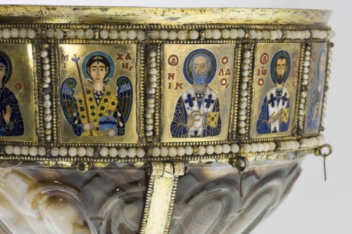 Base troncoconica svasata in argento dorato, con rigonfiamento anulare all'impostazione della coppa; lungo il diametro appiattito del piede vi è una fascia decorativa costituita da due doppie linee di granuli, con al centro una fila di perle, che delimitano inferiormente e superiormente delle placchette trapezoidali d'oro con un'iscrizione a smalto blu. Al di sopra vi sono tre medaglioni smaltati entro una cornice polilobata, con i busti di San Cosma, di Maria e dell'arcangelo Gabriele. Coppa emisferica in onice, decorata a rilievo internamente con un fiorone nel mezzo, esternamente da quindici doppie costolature lobate verticali, separate nella parte superiore da elementi romboidali. Lungo l'orlo corre una fascia in argento dorato con quindici placchette rettangolari con busti policromi a smalto su fondo oro, profilate da granuli e perle: rispettivamente di Cristo, Giovanni Battista, Pietro, Matteo, Marco, Luca, Gregorio il Teologo, Basilio, l'arcangelo Michele, la Madonna, l'arcangelo Gabriele, Nicola, Giovanni Crisostomo, Giovanni apostolo, Paolo. Alcuni piccoli anelli sono posizionati sotto le placchette lungo l'orlo