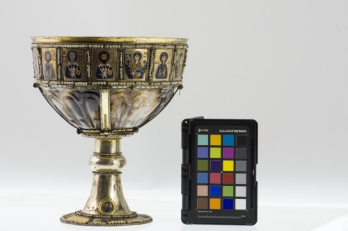 - NOTIZIE STORICO CRITICHE Una coppa più antica ad uso profano venne trasformata in un calice liturgico da una elegante montatura bizantina di X secolo. Non è certa l'epoca e l'ambito produttivo della coppa, databile con riserva al III-IV sec d.C.(Il Tesoro 1986). L'iscrizione sul piede si può riferire con all'imperatore Romano I Lecapeno (920-940) ma anche a Romano II (959-963). Nel medaglione sul piede rappresentante la Vergine vi è l'iscrizione che cita l'Annunciazione: sebbene tra la Madonna e l'arcangelo Gabriele vi sia San Cosma, è indubbia l'intenzione di rappresentare l'Annunciazione, raffigurazione del tutto insolita per un calice bizantino. Agli anellini erano appese ulteriori decorazioni pensili andate perdute