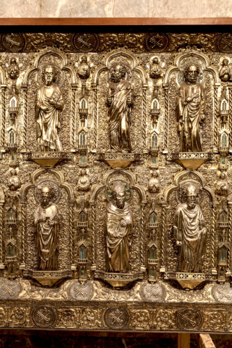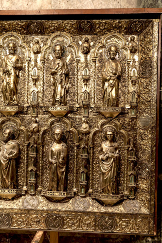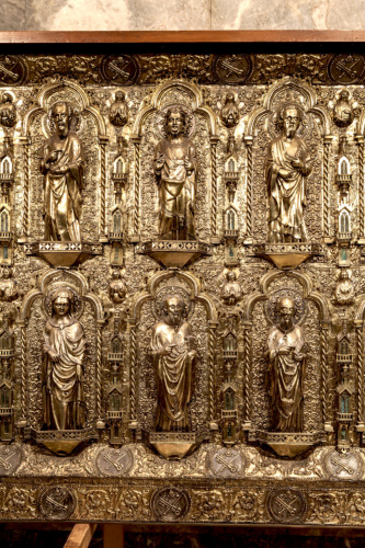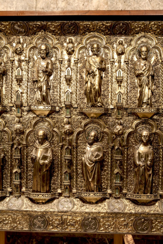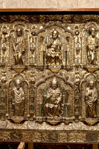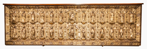 Frontale rettangolare in argento dorato su anima in legno. Decorato da figure in piedi su mensole decorate a traforo, disposte su due ordini entro archi trilobati, retti da colonnine tortili, separati tra loro da piccole cappelle a torre sovrapposte. Nel registro inferiore si trova San Pietro in trono al centro, fiancheggiato da otto santi e quattro sante. In quello superiore al centro è collocato Cristo in trono con ai lati gli Apostoli. Negli angoli degli archi sono inseriti dodici busti di angeli a rilievo nella zona inferiore e quattordici in quella superiore. Tutto il fondo è decorato uniformemente da un ornamento a foglie sbalzate. L'insieme è profilato da due cornici, una obliqua interna ed una perimetrale esterna, decorate con motivi fotomorfici alternati a medaglioni circolari con le insegne papali. Nei lati minori obliqui, entro i medaglioni centrali, sono inserite due iscrizioni