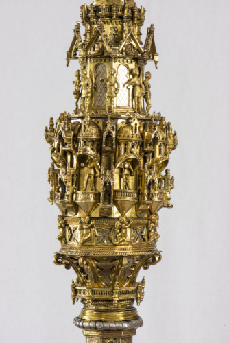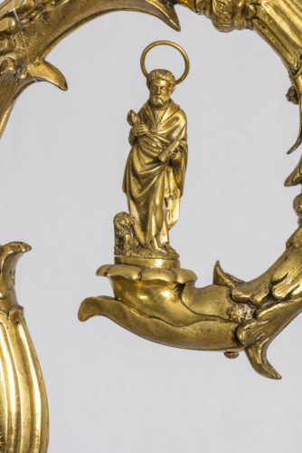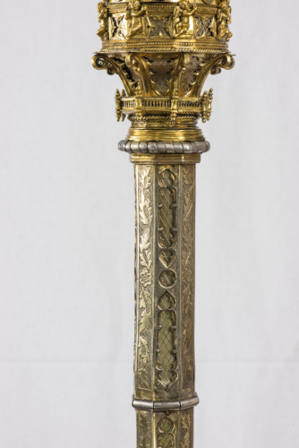 Asta ottagonale composta da otto pezzi su anima in legno, con terminazione in puntale liscio. In ogni segmento le facce verticali sono incise a motivi vegetali su un fondo di intagli incrociati, alternate a facce traforate sostenute da placchette d'argento non dorato decorate a graticcio. Nodo aggettante a sei lati suddiviso in tre zone: in quella inferiore serie di putti alati alternati ad elementi a quattro foglie appuntite, in quella centrale otto nicchie architettoniche con figure in piedi, vestite di armatura, sotto un baldacchino ad arco che ne nasconde la testa, la terza con altre figure in piedi con armatura sotto archi cuspidati. Il manico a riccio è costituito da segmenti a sbalzo congiunti a coda di rondine, sagomati a foglie, terminanti in una statuina a tutto tondo rappresentante San Marco