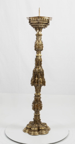 - NOTIZIE STORICO CRITICHE E' in coppia con un altro candeliere del tutto analogo. La fascetta con animali fantastici sul piede è stata realizzata con il medesimo stampo del Reliquiario di S. Isidoro, conservato nel Santuario (Santuario 111). E' costituito da quattro parti avvitate tra loro