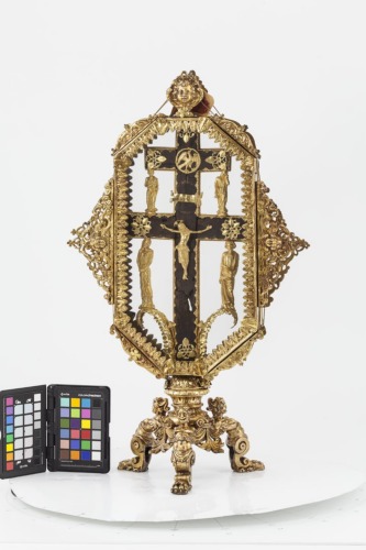 Reliquiario in bronzo dorato, con piede costituito da tre chimere che sostengono un elemento a teca ottagonale in vetro, contornato da una cornice dorata costituita da elementi seriali a foglia. Sui due lati maggiori si collocano degli elementi triangolari a traforo con motivi a tralci vegetali e volute con teste di putto alate al centro. Alla sommità vi è un'altra testa di putto alata con elemento a quadrifoglio in basso. La decorazione della teca si ripete anche sul retro. Al centro della teca si colloca la stauroteca in legno e oro