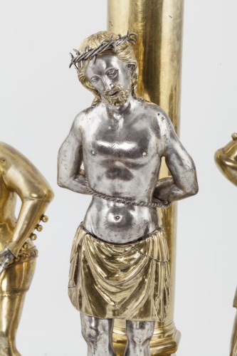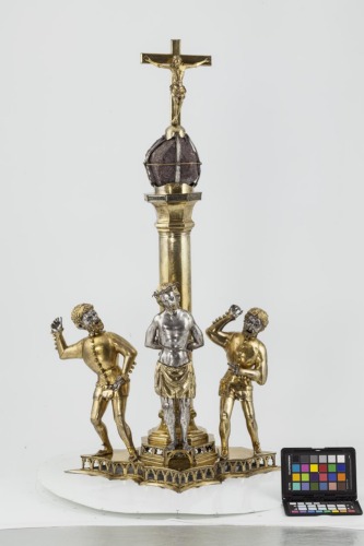Basamento romboidale sagomato a dieci archetti, con zoccolo piatto traforato ad archi gotici. Su di esso si collocano alle estremità due statuette a tutto tondo, rappresentanti i carnefici; al centro vi è Cristo in piedi, posto su uno sgabello, legato ad una colonna cilindrica, con fusto liscio e capitello ottagonale liscio, collocata su un basamento traforato ottagonale. Alla sommità della colonna si colloca la reliquia (un frammento della colonna della flagellazione) trattenuta da quattro listelli e coronata da un Cristo in croce