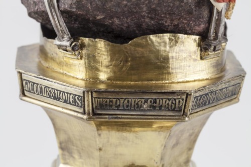 - ISCRIZIONI su otto lastrine alla base della reliquia - MCCCLXXV QUESTA PIERA E PROPIA DELA CHOLONA CHE XPO FO BATUDO. MIS. MICHIEL MORESINI MIS. PIERO CHORNER PROLATORI FE FAR - a niellatura - veneziana