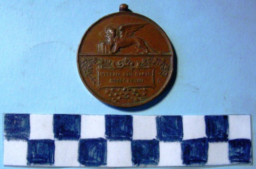 Di forma circolare. Sul recto, bipartito, nella parte superiore, in rilievo, il leone di San Marco andante. Nella parte inferiore iscrizione entro cartiglio coronato rettangolare. Decorazioni a motivi floreali e nastri. Ulteriore iscrizione non leggibile in basso a sinistra. Sul verso, iscrizione al centro, in rilievo.