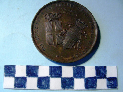 - ISCRIZIONI sul recto, lungo la corona - GLI UFFICIALI E GLI ALLIEVI DELLA SCUOLA MILITARE - lettere capitali - in rilievo -