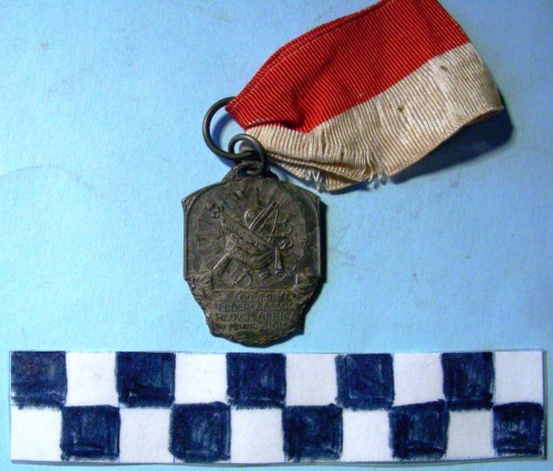 Di forma rettangolare con lato superiore arrotondato e cartiglio sul lato inferiore. Sul recto, al centro, in rilievo, poggiato su rosetta, un trionfo d'armi con bandiere, fucile, sciabola, ancora ed elmetto. Iscrizioni sulla bandiera ed entro cartiglio. Anello all'appiccagnolo e nastrino bipartito bianco e rosso.