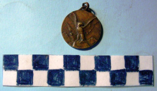 Di forma circolare. Sul recto, al centro, un'aquila spiegata su una roccia. In secondo piano una ulteriore aquila e cime di monti. Sul verso, al centro, iscrizione in rilievo sotto una piccozza e corda simbolo del CAI. Anello all'appicagnolo.
