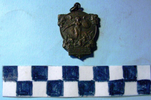 Di forma ovale con decorazioni a motivi floreali sui due lati in alto e cartiglio nella parte inferiore. Sul recto, al centro, in rilievo, figura allegorica femminile con stella raggiante sul capo, ali abbassate, spada sguainata e scudo con stemma sabaudo coronato, in volo sopra un gruppo di soldati con berretto, cappello piumato ed elmetto. A destra un cannone. Iscrizione in cartiglio. Sul verso, al centro, in rilievo una crocerossina che porge una tazza ad un soldato ferito ad un braccio, seduto su di un letto. Sotto la figura una croce greca di colore rosso in tondo bianco ornato a motivi floreali. Anello all'appiccagnolo.