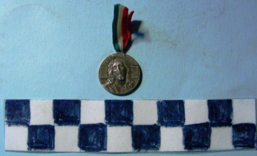 Di forma circolare. Sul recto, al centro, in rilievo, il busto di fronte di Cristo. In secondo piano croce raggiante. Sul verso, al centro, in rilievo, un'ancora, su stella a cinque punte, con il fusto termimante a croce raggiante. Iscrizione lungo la corona. Nastrino tricolore con i colori nazionali.