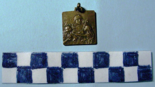 Di forma quadrata. Sul recto, al centro, in rilievo due fanciulle di fronte a braccia protese. Piccola vittoria alata a sinistra sotto la figura nimbata e raggiante di soldato con elmo Adrian. Iscrizione entro l'aureola. Sul verso, in rilievo, nella parte superiore, stemmi di Trento e Trieste entro corone d'alloro con al centro scudo Sabaudo coronato. Iscrizione sotto le figure. Anello all'appiccagnolo.