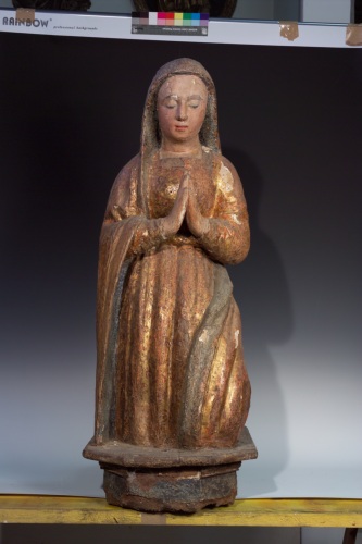 Scultura lignea dorata e policroma rappresentante una figura femminile orante con panneggio, che poggia su una base lignea dotata di iscrizione sul lato sinistro, che comproverebbe la sua funzione di opera devozionale. Si tratta di una Annunciata.