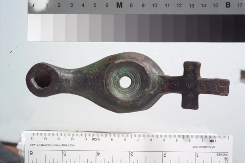 Lucerna in bronzo con croce punzonata sull'impugnatura, mancante del fondo.