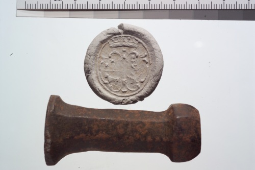 sigillo in bronzo con leone marciano e impugnatura con stemma trocato semipartito; nella parte superiore un'aquila sotto tre stelle.