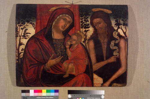Dipinto su tavola con Madonna con Bambino del tipo Galaktotrophousa e San Giovanni Battista a sinistra.