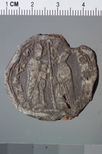 bolla plumbea del doge Francesco Molin Reca sul recto San Marco, a sinistra, regge con la destra un vessillo mentre il doge, a destra, reso di profilo e più piccolo del santo, regge l'asta del vessillo con la sinistra.