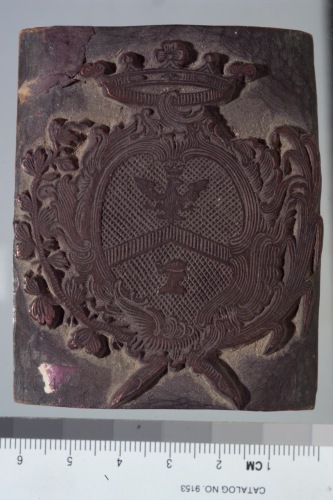 stampo in legno di stemma coronato con aquila in maestà e uomo bendato.