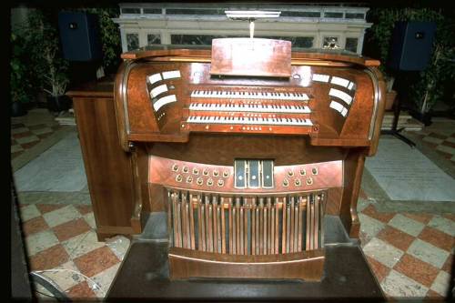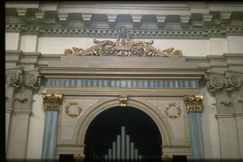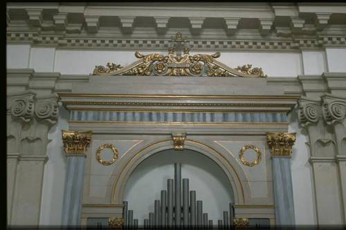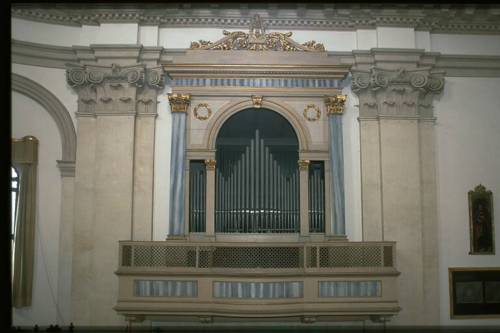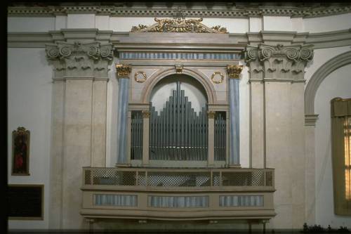 Organo costruito riutilizzando, con aggiunte (Positivo), somieri e fonica del precedente strumento, costruito da Annibale Pugina & Figli nel primo '900. Prospetto sinistro in tre campate, costituite da 5-19-5 canne in stagno tigrato, in parte (14 canne) appartenenti in origine al Principale 8' dell'O.P., in parte finte. Canne con labbro superiore a mitria sporgente, prive di baffi. Canna maggiore Do1. Prospetto destro in tre campate, costituite da 5-23-5 canne in stagno tigrato, labbro superiore a mitria sporgente, di fattura diversa (Pugina) da quelle del prospetto sinistro; canna maggiore Do1 del Principale 8' del G.O.. Entrambi i prospetti: andamento delle bocche rettilineo, profilo planimetrico rettilineo. Consolle rotabile, indipendente, posta in coro dietro l'Altare Maggiore, realizzata dalla ditta Tamburini. Trasmissione elettropneumatica per G.O., Recitativo e Pedale, in parte elettrica (per il somiere a tiro), in parte elettropneumatica (per il somiere Pitman) per l'O.P.. 3 tastiere originali, cromatiche di 61 tasti, estensione Do1-Do6, ricoperte in materiale plastico. Ordine delle tastiere moderno: I O.P., II G.O., III Rec.. Pedaliera originale, concava radiale, cromatica, indipendente, di 32 pedali, estensione Do1-Sol3, cromatici con riporto superiore in ebano.