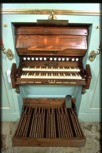 Prospetto in tre campate, ciascuna formante una cuspide, di 7-9-7 canne instagno con baffi, appartenente al Principale 8' del G.O., labbro superioree scudo sporgente, canna maggiore è al Fa#1. Andamento bocche canne di prospetto: campate laterali: pressoché rettilineo; campata centrale: contrario all'andamento della cuspide. Profilo planimetrico del prospetto: rettilineo. Consolle a finestra. Trasmissione meccanica a bilancia. Due tastiere,originali, cromatiche, di 56 tasti, estensione Do1-Sol5, ricoperte in osso ed ebano, I G.O., II O.E. Pedaliera concava parallela, cromatica, indipendente, di 27 pedali, estensione Do1-Re3. Registri azionati con tiranti a pomello, in unica fila orizzontale sopra la II tastiera, cartellini in materiale ceramico, a stampa, caratteri corsivi, originali, applicati sui pomelli stessi. Disposizione fonica: G.O.: Principale 8, Ottava 4, Decima quinta 2, Pieno 2 file, Dulciana 8, Voce celeste 8; O.E.: Bordone 8, Gamba 8, Salicionale 4, Eolina 8 (oscillante), Oboe 8 (recte: oggi flautino 2); Ped.: Ped.Subbaso 16, Ped Bordone 8. Accessori: 6 pedaletti ad incastro, in ferro, posti frontalmente sopra la pedaliera; cartellini in osso, incisi e smaltati con scritte in blu, applicati anteriormente e parte orizzontalmente nelle tavole sottostanti la I tast. Al di sotto della prima tastiera: Unione ped. alla I tast., Unione ped. alla II tast., Unione I tast. Alla II, Forte I tast., Forte II tast.. Tremolo (scritta recentiore: in origine: oboe) (al II man). Staffa a bilico per l'Espressione (in origine comandata da pedaletto ad incastro); 3 pistoncini, in osso, 2 per la comb. fine (funzionante mediante leve Barker), più il relativo annullatore.