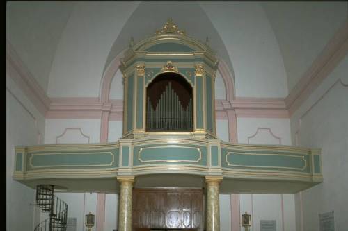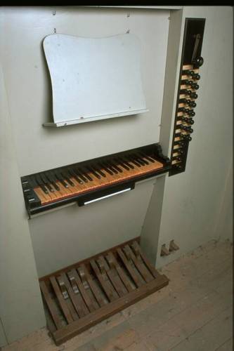 Op.157, prospetto in unica campata, a cuspide centrale con ali laterali ascendenti, formato da 25 canne in stagno, labbro superiore a mitria con puntino soprastante, appartenute al Principale 8', canna maggiore: Mi1. Andamento bocche: rettilineo; profilo planimetrico: rettilineo. Ai piedi del prospetto le canne dei Tromboncini. Consolle a finestra. Trasmissione meccanica sospesa. Tastiera originale, in sesta, di 47 tasti, estensione Do 1- Re 3, diatonici, ricoperti in basso con frontalini a chiocciola (copertura e frontalini rifatti restauro Piccinelli; cromatici in pero tinto di nero,con listarella superiore in ebano, con due puntini intarsiati, uno verso l'estremità anteriore della stessa, l'altro verso la posteriore. Pedaliera in sesta, a leggio, ricostruita nel restauro Piccinelli, di 17+1 pedali, unita alla tastiera, estensione Do 1- Sol diesis 2, 12 note, 18 pedale Tamburo. Cromatici non ricoperti. Quadro fonico alla destra dell'organista; registri azionati da tiranti a pomello, in due file verticali. Cartellini astampa, stampatello minuscolo marrone con iniziali maiuscole. Il quadro fonico è stato ricostruito nel restauro Piccinelli.