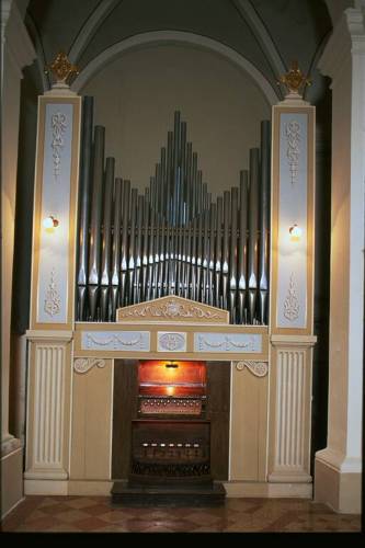 - NOTIZIE STORICO CRITICHE Precedentemente all'attuale strumento esisteva un organo 'doppio' costruito da Girolamo Zavarise di Verona nel 1813. Di questo i Pugina riutilizzarono soltanto il prospetto cui i Quaglio, nella realizzazione dell'attuale assetto della facciata, aggiunsero le due canne maggiori. L'organo Pugina era, in origine, collocato in cantoria in controfacciata; quando questa fu demolita, negli anni '20 del XX secolo, lo strumento fu trasferito in corodietro l'Altare Maggiore; da questa sede fu poi di nuovo spostato e collocato nell'attuale posizione.