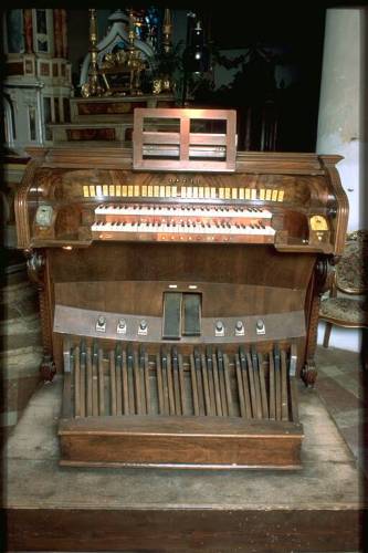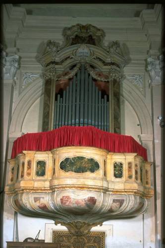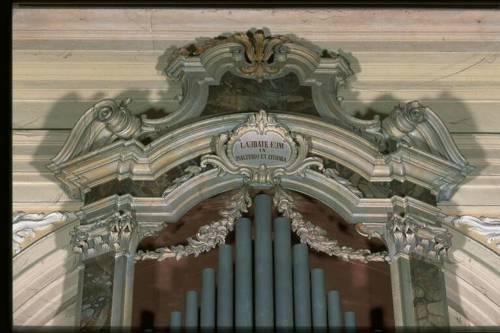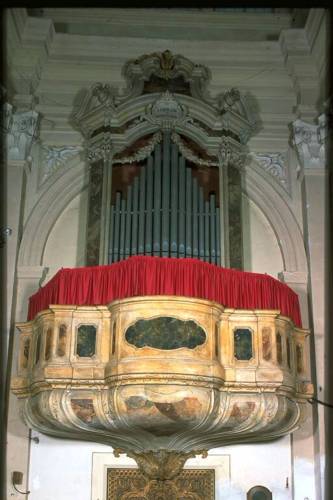 Organo costruito riutilizzando una consistente parte della fonica del precedente strumento costruito da Gaetano Callido nell'anno 1800, op. 371 nonché altre canne antiche di caratteristiche analoghe, ubicato in due cantorie in presbiterio, alla destra e sinistra dell'Altare Maggiore, chiuso in due casse nelle due nicchie della parete. Il corpo di destra comprende il G.O. (ad eccezione delle prime note del Principale 16') e la basseria; quella di sinistra l'O.E. e, in facciata, le prime 17 canne del Principale 16'del G.O.. Prospetti in unica campata, costituiti ciascuno da 17 canne in zinco alluminato con baffi, labbro superiore a mitria sporgente, appartenente, per il corpo di destra al Principale 8' del G.O. (canna maggiore Do1),per il corpo di sinistra al Principale 16' del G.O. (canna maggiore Do2, prima nota del registro). Andamento bocche: rettilineo. Profili planimetrici: leggermente bombati in corrispondenza delle tre cuspidi. Consolle indipendente, rotabile, ubicata in Presbiterio, nel lato destro. Trasmissione elettropneumatica. Due tastiere originali, ricoperte in materiale plastico (in origine galalite) ed ebano, cromatiche, di 61 tasti, estensione Do1-Do6. Pedaliera originale, concava radiale, cromatica, indipendente, di 32 pedali, estensione Do1-Sol3, cromatici dipinti di nero. grigio per il pedale. Registri azionati da placchette a bilico in celluloide, scritte incise sulle placchette, stampatello maiuscolo, rosso per il G.O., grigio per il pedale; in un'unica fila orizzontale sopra la II tastiera.