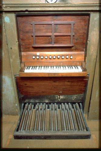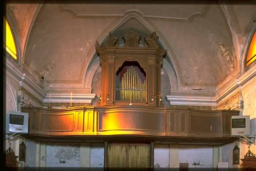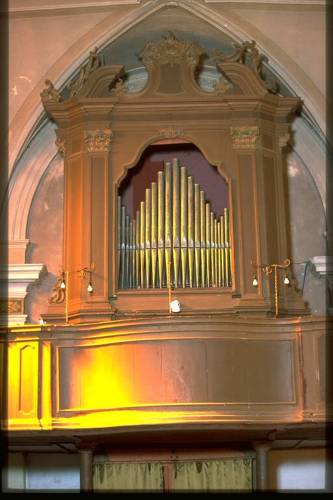 Op. 186. Prospetto in unica campata, a cuspide centrale con ali laterali ascendenti, costituito da 23 canne in stagno, labbro superiore a mitria, appartenenti al Principale 8', canna maggiore è il Sib1. Andamento delle bocche rettilineo, profilo planimetrico rettilineo. Consolle a finestra. Trasmissione meccanica sospesa. Una tastiera non originale, cromatica, di 54 tasti, estensione Do1-Fa5, ricoperta in osso ed ebano. Pedaliera diritta, non originale, cromatica, di 27 pedali costantemente unita alla tastiera, estensione Do1-Re3, reali 12 note. Registri azionati con tiranti a pomello,in unica fila orizzontale sopra la tastiera; cartellini recenti, in materiale plastico, circolari, applicati frontalmente sui pomelli stessi; scritte incise, stampatello nero, maiuscolo.