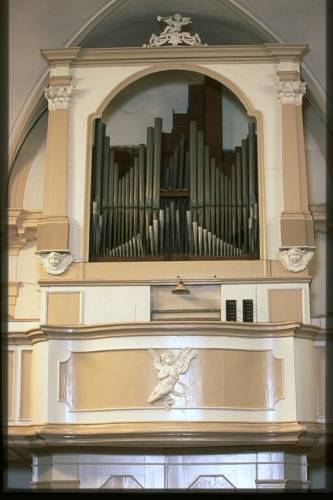 Prospetto in unica campata, a cuspide centrale con ali laterali ascendenti, formato da 27 canne in stagno del Principale 8', con labbro superiore a mitria, canna maggiore è il Sol1. Andamento delle bocche in facciata: rettilineo. Profilo planimetrico della facciata: rettilineo. Le tre canne maggiori, cadute alcuni anni fa, sono ora conservate in altro locale della chiesa, non specificatoci. Alla base del parapetto le canne della Tromba Soprani. Consolle a finestra. Trasmissione meccanica sospesa. Una tastiera, cromatica, non originale, di 56 tasti, estensione Do1-Sol5, ricoperta in galalite ed ebano. Pedaliera concava parallela, di fattura Zordan, con 1 foro in ciascun cromatico, di 25 pedali, cromatica, estensione Do1-Si2, 25° pedale Tamburo, costantemente unita alla tastiera, reali 12 note. DivisioneBassi - Soprani: Si2 - Do3. Quadri fonici alla destra dell'organista, uno per ciascuna delle due file verticali delle manette. Manette alla lombardacon incastro a sinistra, impugnatura tornita con puntino in osso, ad intarsio, nella punta. Due impugnature di manette risultano spezzate, una sola è conservata. Etichette a stampa, non originali.