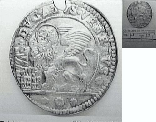 Dritto: .S.M.V.ALOYSIVS.CON[T].D.;il Doge ing.ricrve da San Marco seduto in trono il vessillo della Repubblica;esergo,rosettaS.Brosetta. Rovescio: DVCAT[V]S.VENETVS rosetta;leone alato stante a s.con zampa anteriore d.poggiata sul Vangelo; alle spalle castello;esergo,tre rosette