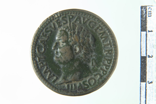 Dritto: Busto laureato di Tito a s.; contorno perlinato. Rovescio: Figura femminile seduta a d., gemente, sotto un albero di palma, dietro la quale sta un guerriero a d. con un gruppo di armi; contorno perlinato