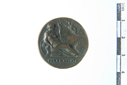 Dritto: Busto barbato a d.; contorno lineare. Rovescio: Figura femminile seduta a d. con lancia, a d. in alto Vittoria volante a s. con corona d'alloro, in basso altare acceso ; contorno lineare