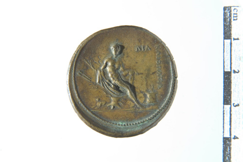 Dritto: Busto diademato e drappeggiato a d.; contorno perlinato. Rovescio: Figura maschile gitara di tre quarti, seduta a d. su tronco a cui è appesa una faretra; in basso a s. ariete accosciato a s., a d. altare acceso; contorno perlinato