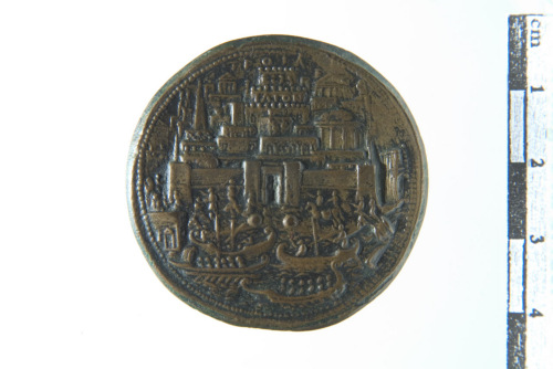 Dritto: Busto barbato con tenia nei capelli a d.; contorno perlinato. Rovescio: Raffigurazione frontale, panoramica, di città antica fortificata con portale nelle mura; davanti marosi su cui imbarcazioni; contorno perlinato