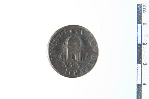 Dritto: Testa laureata di Cesare a d.; contorno a bordo. Rovescio: Edicola templare con ai lati figure umane; contorno a bordo