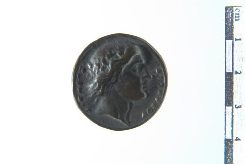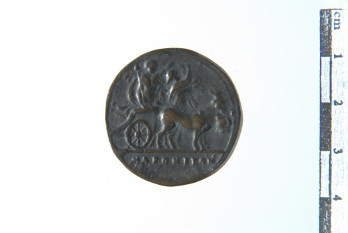 Dritto: Testa a d.; contorno lineare. Rovescio: carro trainato da una tigre e una capra a d., con sopra Dioniso con tirso; a lato del carro una baccante con cembali; contorno lineare