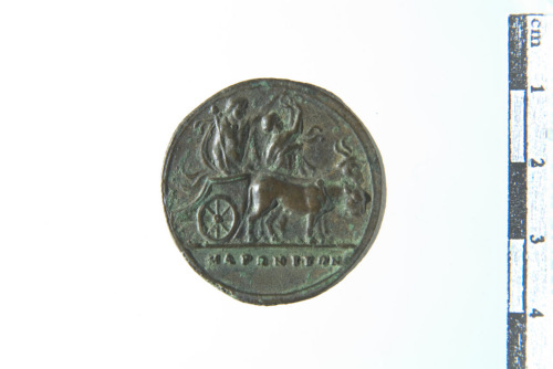 Dritto: Testa a d.; contorno lineare. Rovescio: carro trainato da una tigre e una capra a d., con sopra Dioniso con tirso; a lato del carro una baccante con cembali; contorno lineare