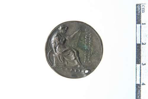 Dritto: Testa barbata a d.; contorno lineare. Rovescio: Figura femminile seduta su cippo con armi a s., con tavola scritta appoggaiata sulle ginocchia; contorno lineare
